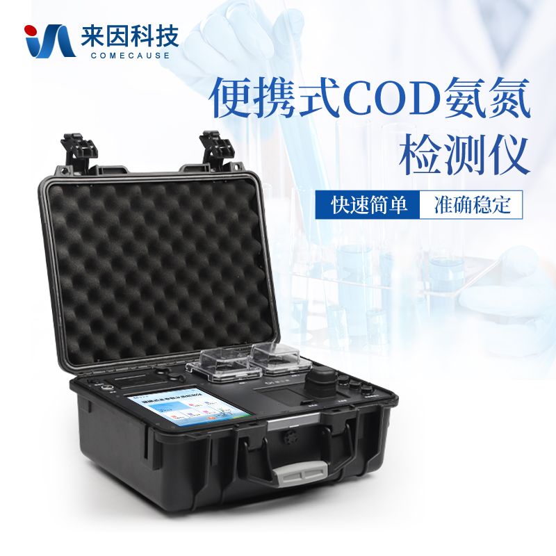 便携式COD氨氮检测仪采用高强度PVC工程塑料手提箱设计,消解检测一体式设计,其中消解模块具备双温区功能,检测部分同时具备360°旋转比色管检测和比色皿检测,安卓智能操作系统,8英寸高清液晶触摸屏,光纤检测技术,进口光源,内置大容量锂电池,便携多参数水质检测仪具有性能稳定、测量准确、测定范围广、功能强大、操作简单等特点。